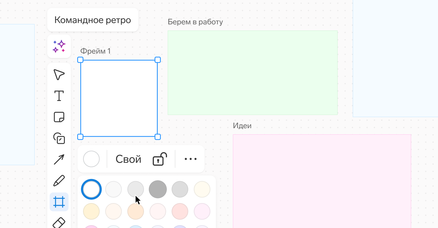 Чтобы создать фрейм, нажмите на иконку решетки на панели инструментов: выберите цвет, задайте положение на доске и размер, введите название. Внутри фрейма можно размещать любые объекты — они автоматически привязываются к нему. Если нужно переместить логический блок целиком, просто перетащите фрейм: все элементы внутри сохранят свое расположение.
